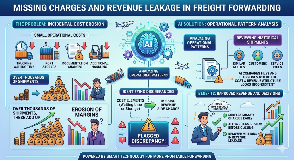 For example, if certain shipments consistently include specific cost elements — such as trucking waiting time or port storage — but the revenue side of the file does not include the corresponding charge, the system can flag the discrepancy.