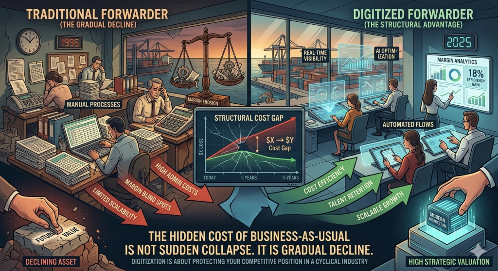 The lack of clear ROI has long contributed to the industry’s status as a digital laggard. Many forwarders still rely on email, spreadsheets, and legacy systems because “the old way works.” However, as the logistics ecosystem evolves, the baseline for participation is changing.