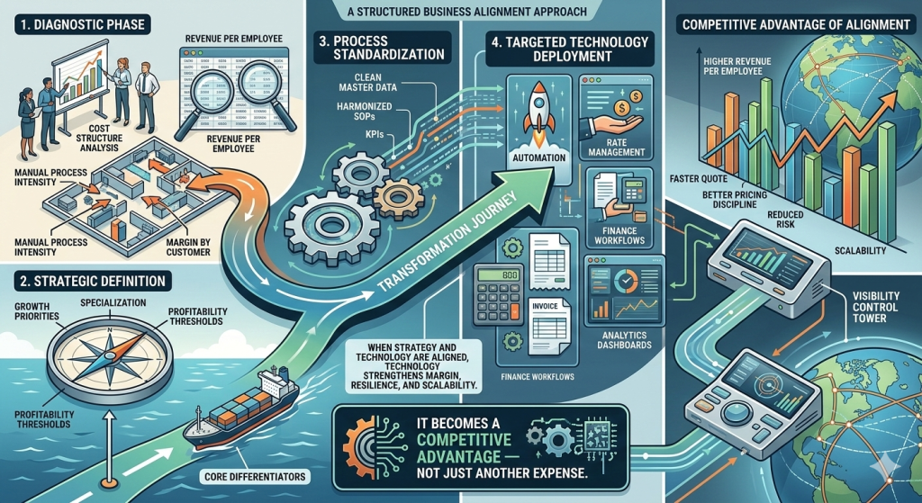 The path forward isn’t about adopting every new tool. It’s about strategic prioritisation — identifying where digital investments align with business outcomes. For SME forwarders, this means: