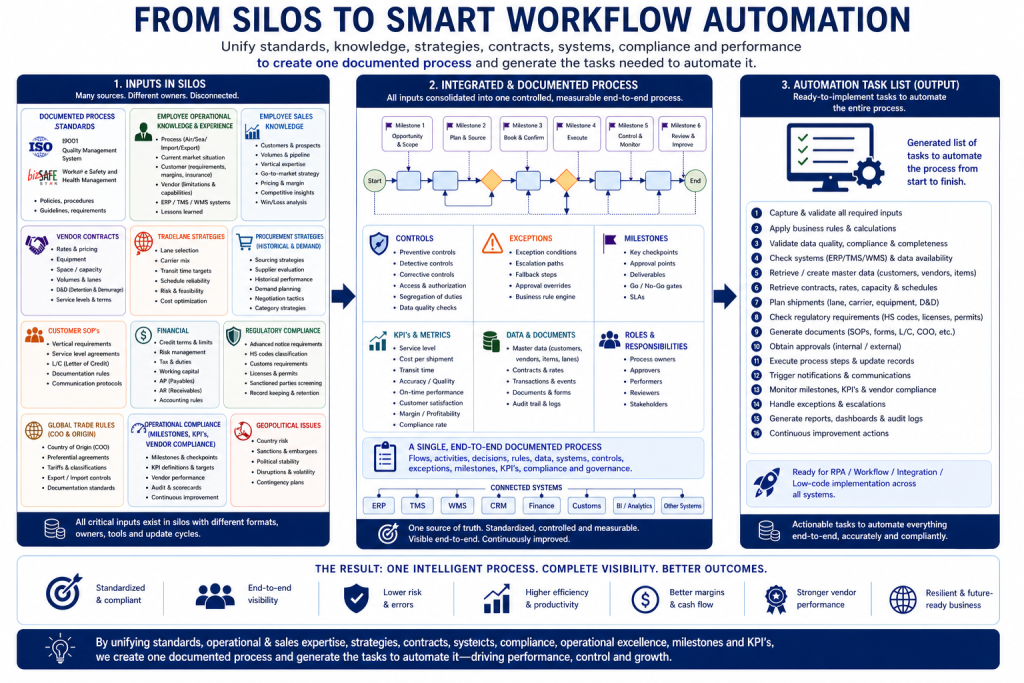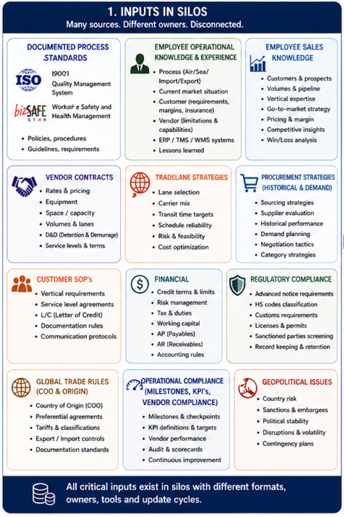 - Consolidate knowledge from operations, sales, procurement, finance, and compliance